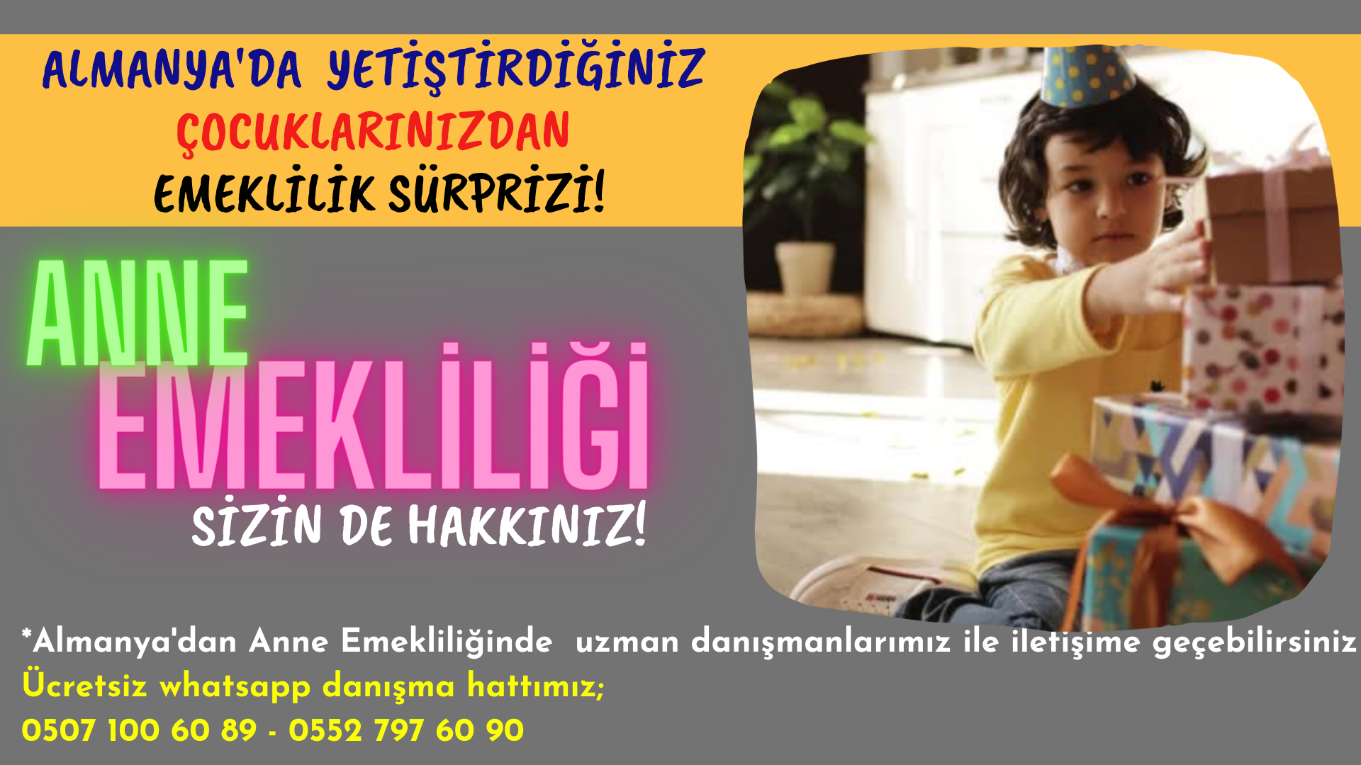 Bu konuda bilgi almak isteyen annelerimiz ; Dünya Emeklilik Merkezi'nin +90 552- 797 60 90 veya +90 507- 100 60 89 nolu danışma hatlarından bizle...